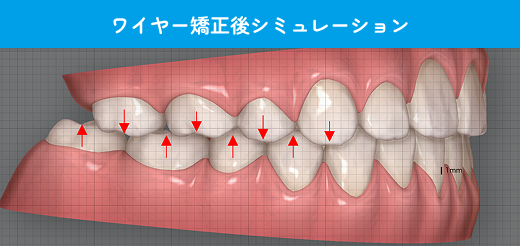 ワイヤー矯正が完了して、綺麗な⻭並びに⾒えますが、正しい噛み合わせは、⾚⽮印で⽰した通り、上の⻭と下の⻭が交互に噛み合っている状態です。
