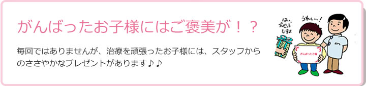 まだまだたくさんありますが、子どもが「歯医者さん好き!」と思ってもらえるように、そうすることで、その子どもの将来の健康を守ってあげられることをいつも考えながら、私たちは診療しています。